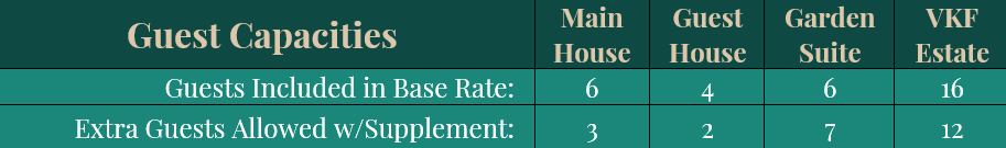 To ensure your group’s lodging needs are comfortably met, review the table below. The numbers describe sleeping capacities for each of the residences and the entire estate from a variety of perspectives, including what we might suggest and what is possible depending on your group’s needs.
