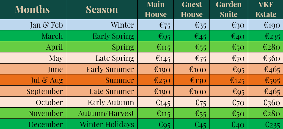 The table below lists Villa Koukouvayia’s base lodging rates by season for each residence—and the entire estate should you need that capacity. Each rate, multiplied by the days you will lodge your group, will form the basis of your costs.