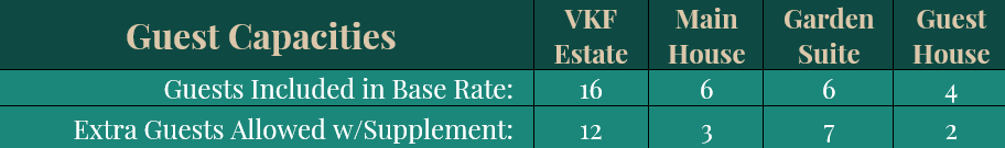 To ensure your group’s lodging needs are comfortably met, review the table below. The numbers describe sleeping capacities for each of the residences and the entire estate from a variety of perspectives, including what we might suggest and what is possible depending on your group’s needs.