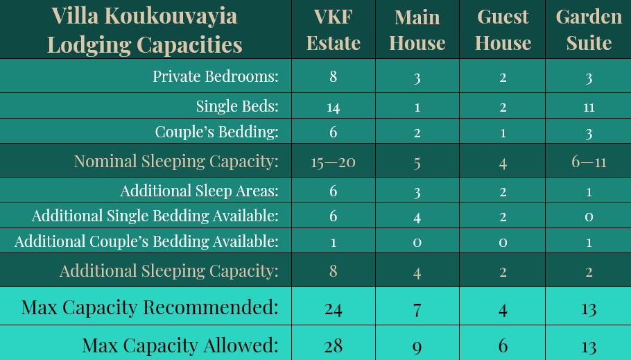 Villa Koukouvayia Farms is a unique property, with unique residences, rooms and capacities. By design, she is not a hotel filled with a bank of identical rooms, but a home to share with those who want such ambience. And while her lodging capacities are not simple to describe, their flexibility is her greatest asset, whether for a strategic program needing a coherent campus for multiple private individuals, or a large, loving family or friendship group seeking a unified estate for gathering or event celebration.