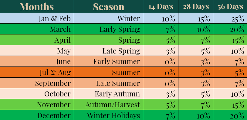 We provide generous, season-based discounts for programs staying longer than two weeks. These discounts apply to the base reservation cost before taxes or extra occupancy charges, and include all residential options, as shown in the table below: