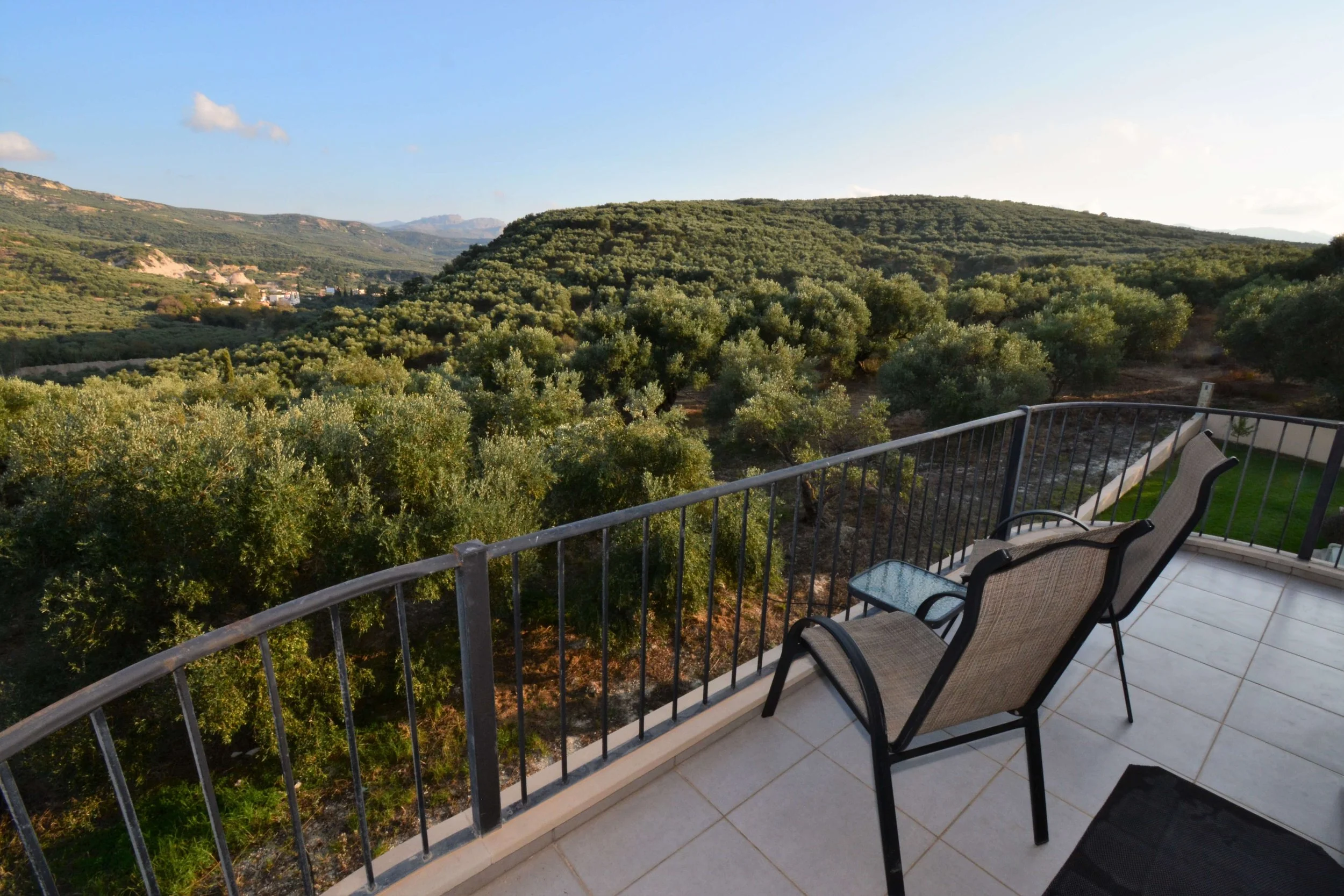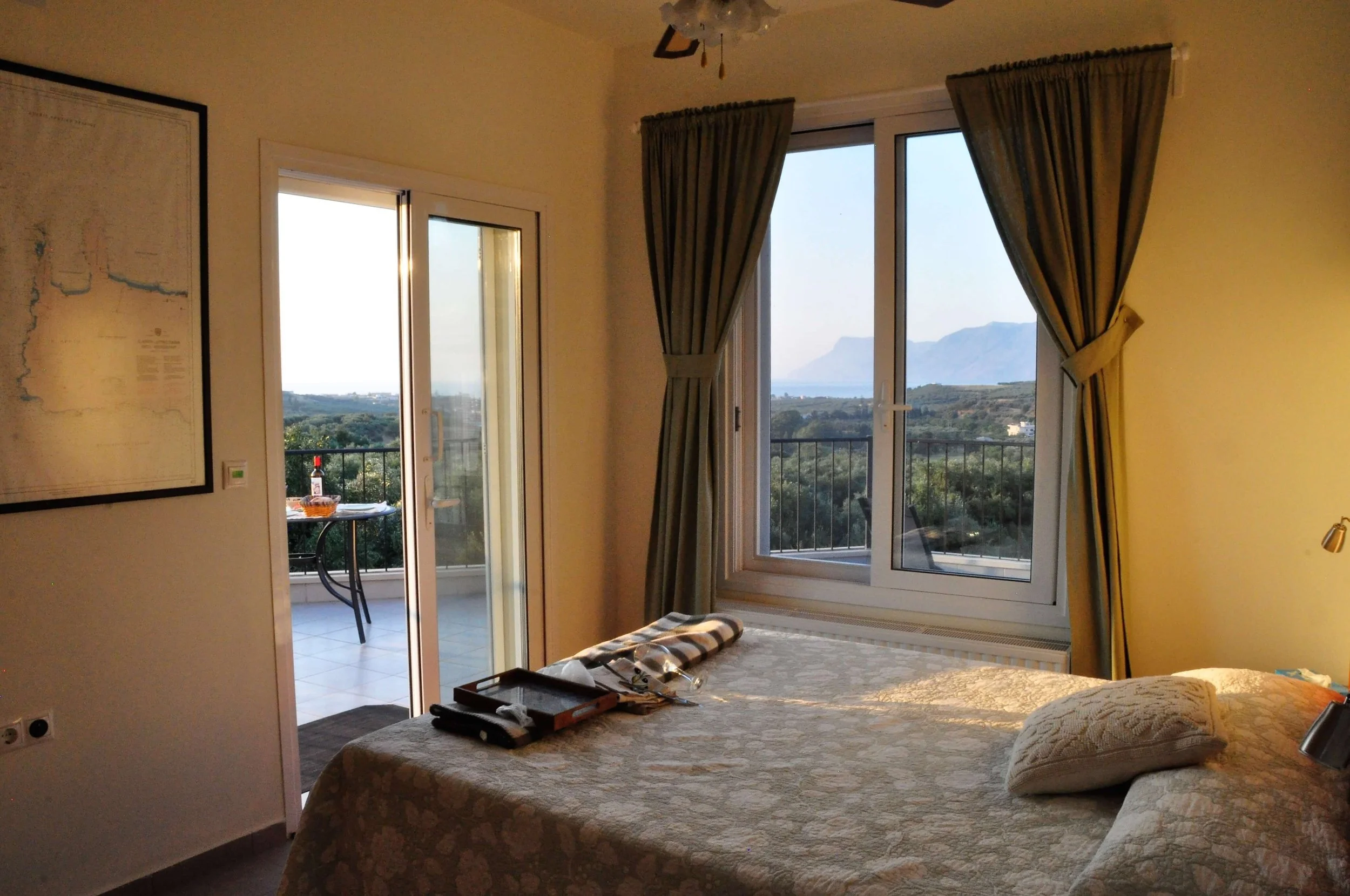 Couple’s bedding, large, private wrap around balcony & roof terrace with views of Aegean & southern mountains.